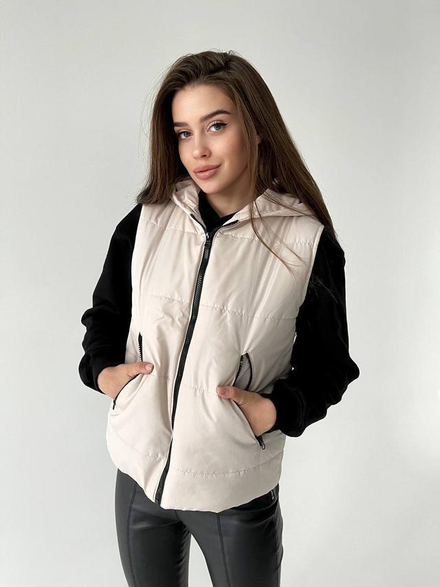 Плащевый стьобаний жилет на силіконі з капюшоном і кишенями, на блискавці (р. 42-52)