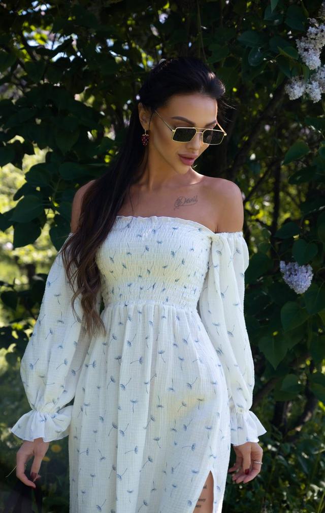 Квіткова сукня міді з резинкою на грудях відкритими плечима та розкльошеною спідницею (р. 42-46) 66035716Q