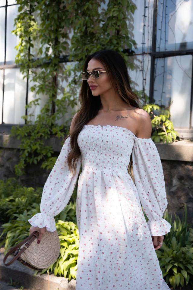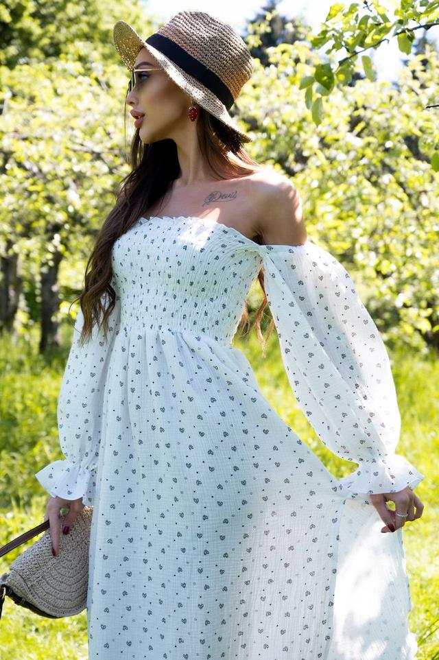 Квіткова сукня міді з резинкою на грудях відкритими плечима та розкльошеною спідницею (р. 42-46) 66PL5716Q